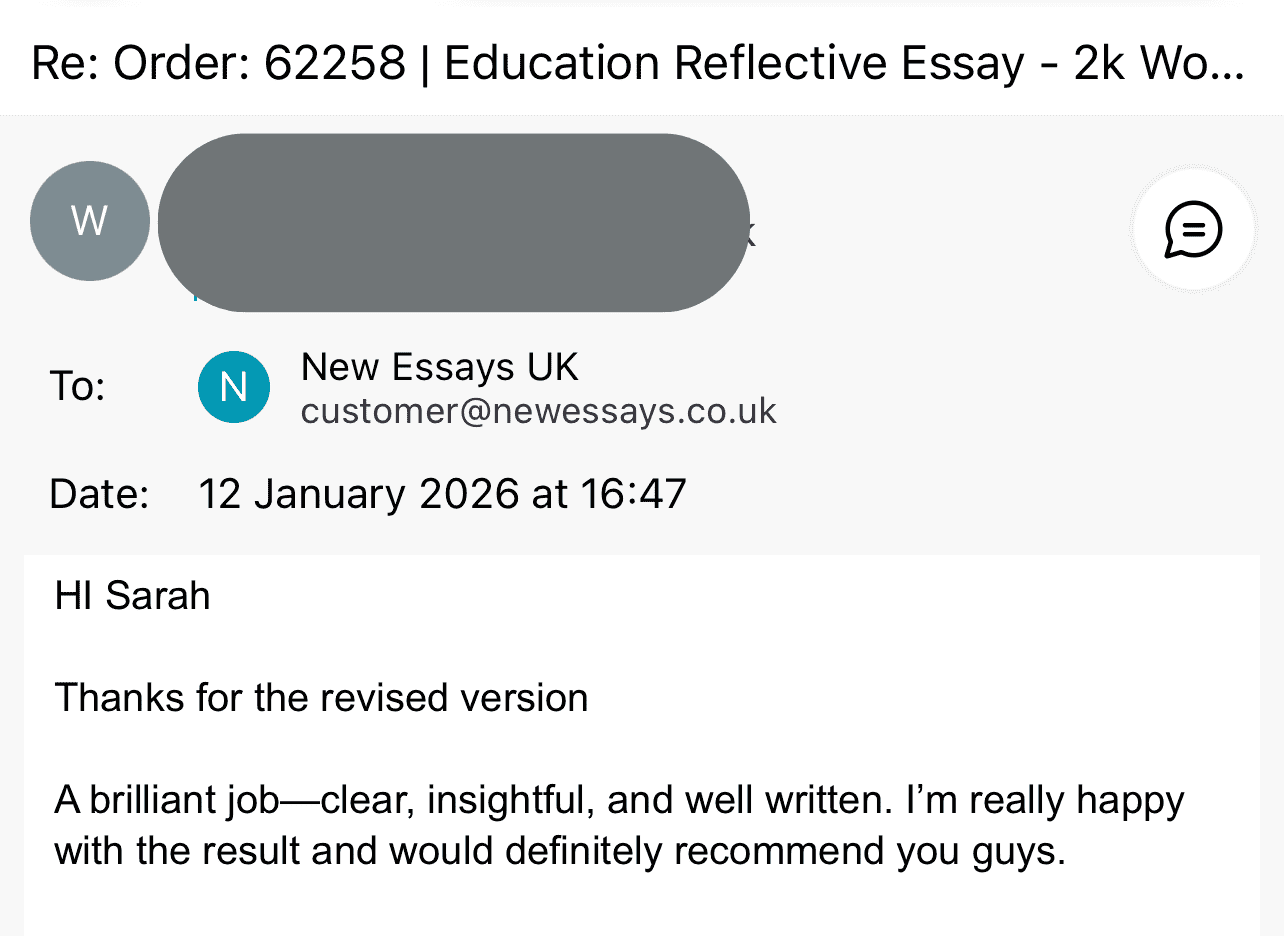 “As a result of New Essays catching my mistakes, the quality of the final output was significantly higher than it could have been. This has resulted in an essay that I am confident portrays a professional image. The fast turnaround meant that I was able to submit it sooner than I had originally anticipated”